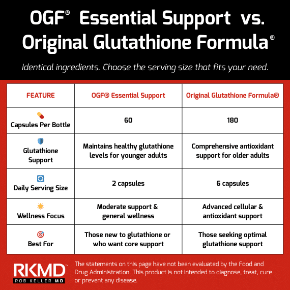 OGF® Essential Support is a 60 capsule bottle of the exact same Original Glutathione Formula® that thousands of RobKellerMD® customers already trust. The only difference is the serving size.